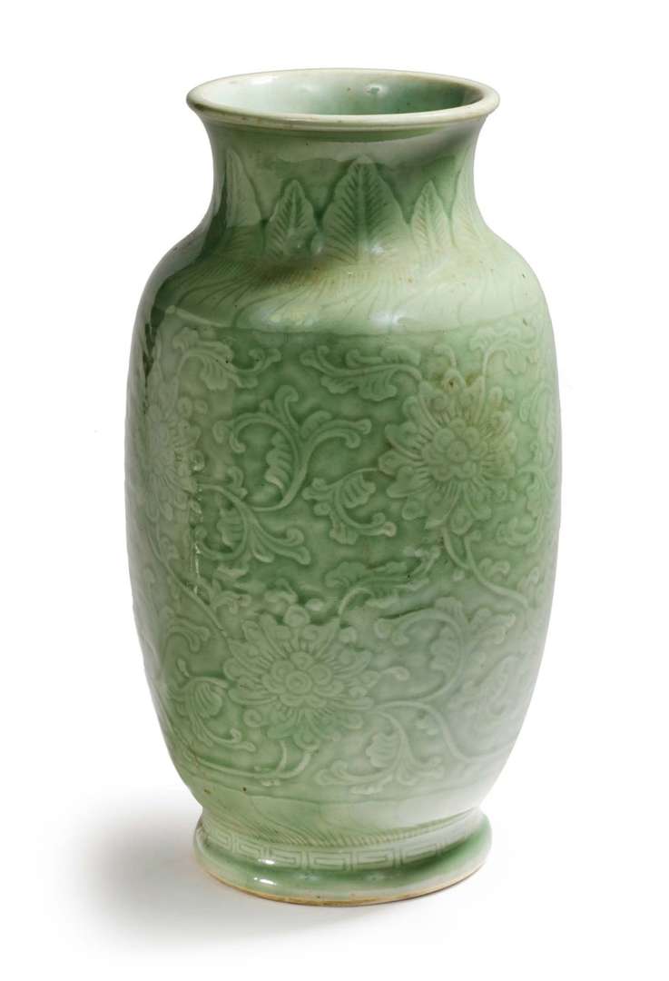 Vase balustre en porcelaine émaillée céladon à col évasé et décor sous couverte de fleurs de lotus épanouies accompagnées de leurs rinceaux feuillagés. Grecques, pétales et feuilles de bananier complètent l'ornementation du vase.