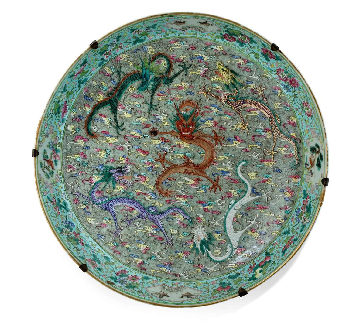 Importante coupe en porcelaine et émaux de la famille rose, à décor en médaillon central de cinq dragons déroulés poursuivant la perle sacrée parmi nuages stylisés reprenant la forme de ruyi et spirales. L'aile décorée en polychromie d'oiseaux, fruits, fleurs et feuillages reposant sur un fond turquoise.
