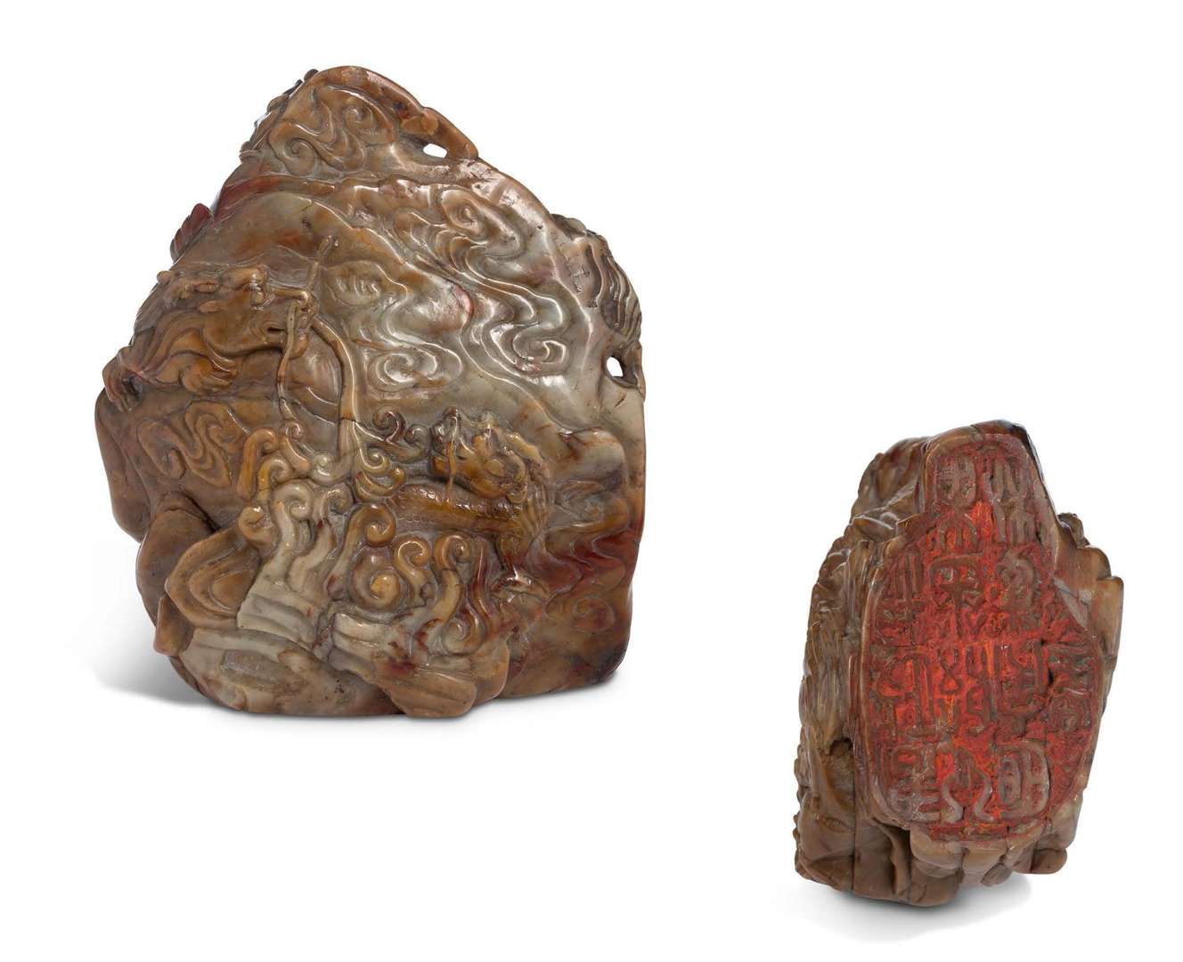 Sceau en stéatite beige légèrement infusée de brun-rouge représentant dragon et carpe sur un rocher battu par des flots écumants d'où émerge la perle sacrée.