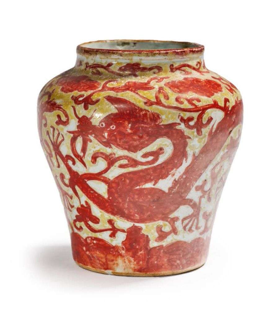 Petite jarre en porcelaine à décor émaillé rouge de fer de deux dragons àcinq griffes, sur un fond blanc-grisé avec traces d'émail jaune.
