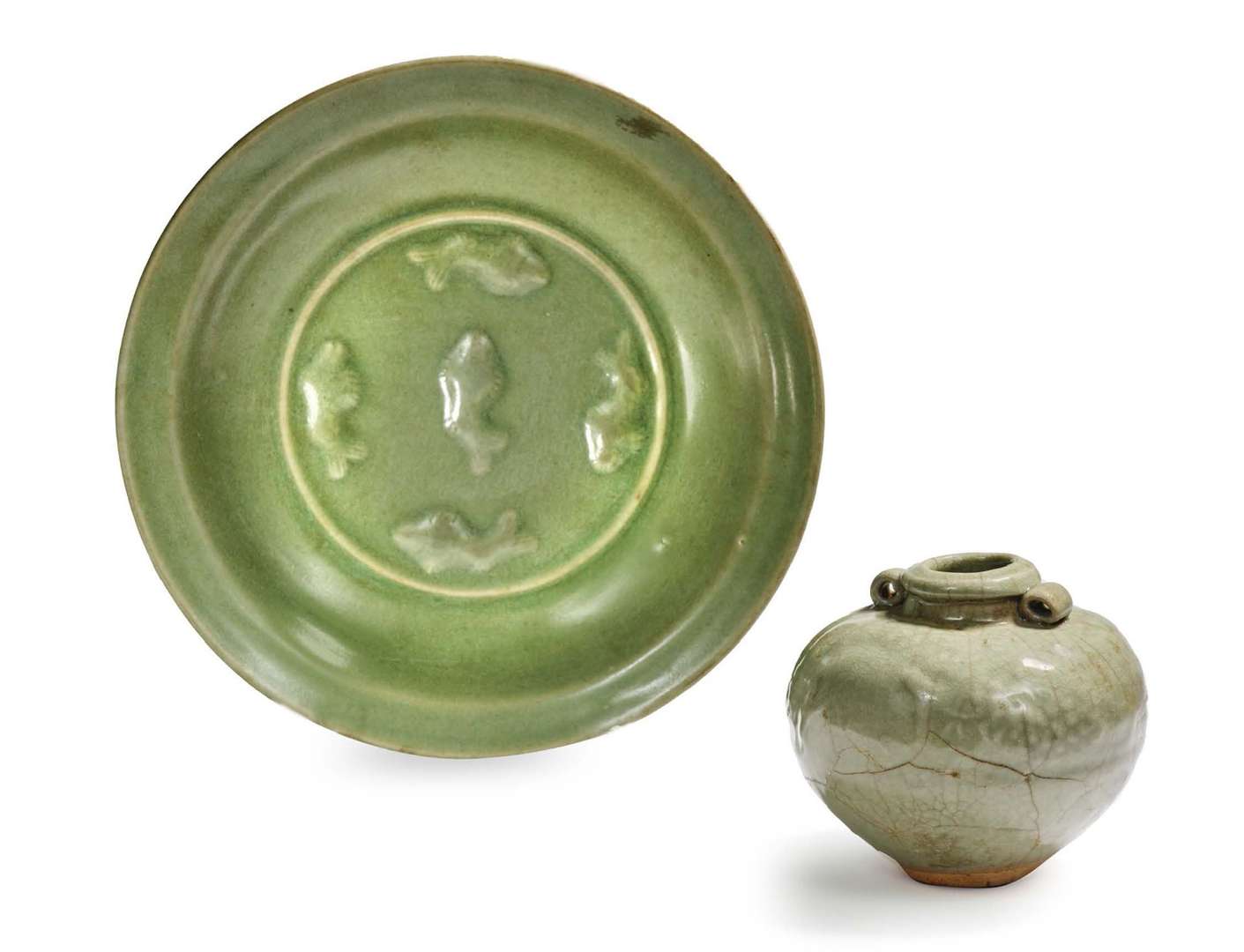 On y joint une petite jarre en grés émaillé céladon craquelé, à décor en léger relief sous la couverte, le col rehaussé de deux petites anses tubulaires.