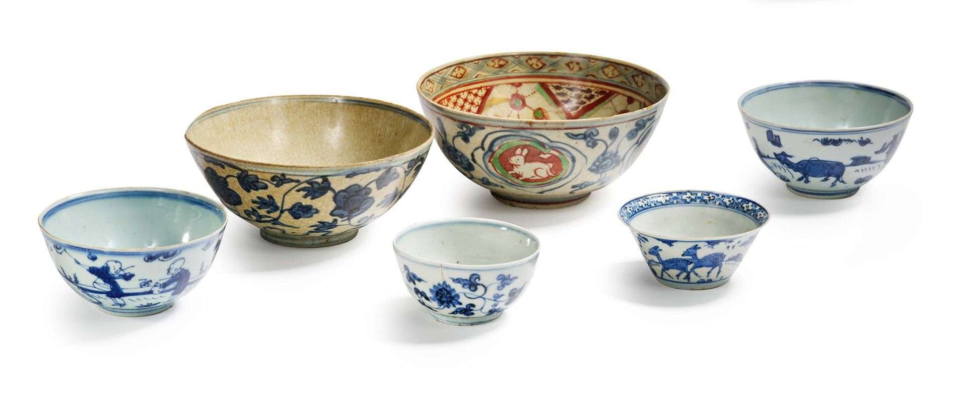 Lot de six coupes en porcelaine dont cinq à décor en bleu sous couverte : de rinceaux floraux sur fond beige craquelé pour l'une | de personnages dans des jardins pour une seconde | de daims et singes pour une troisième | de rinceaux floraux pour la quatrième et cinquième.