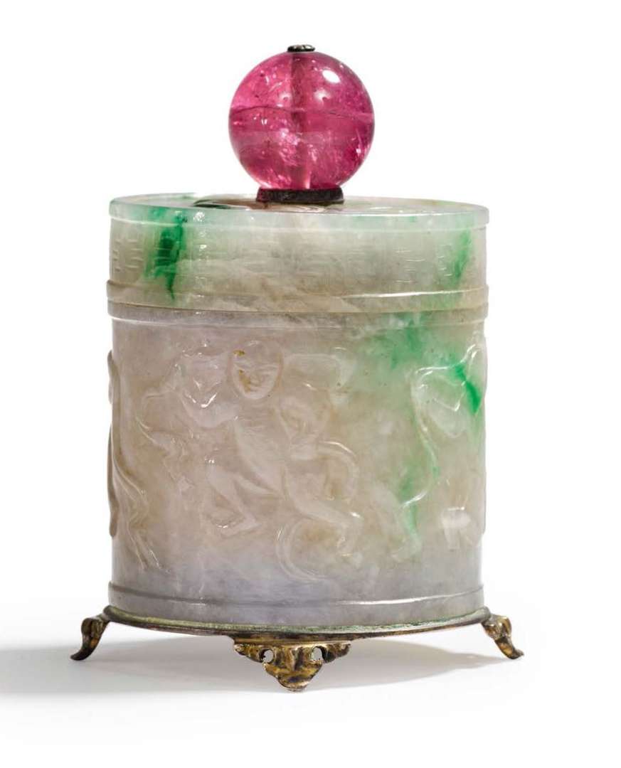 Petite boite cylindrique en jadéite blanc grisé veinée d'émeraude, à décor en léger relief d'enfants, le couvercle avec charnière, surmonté d'une perle en tourmaline, la base cerclée de cuivre doré, l'intérieur doublé de métal argenté avec marque de la maison « Yamanaka ».