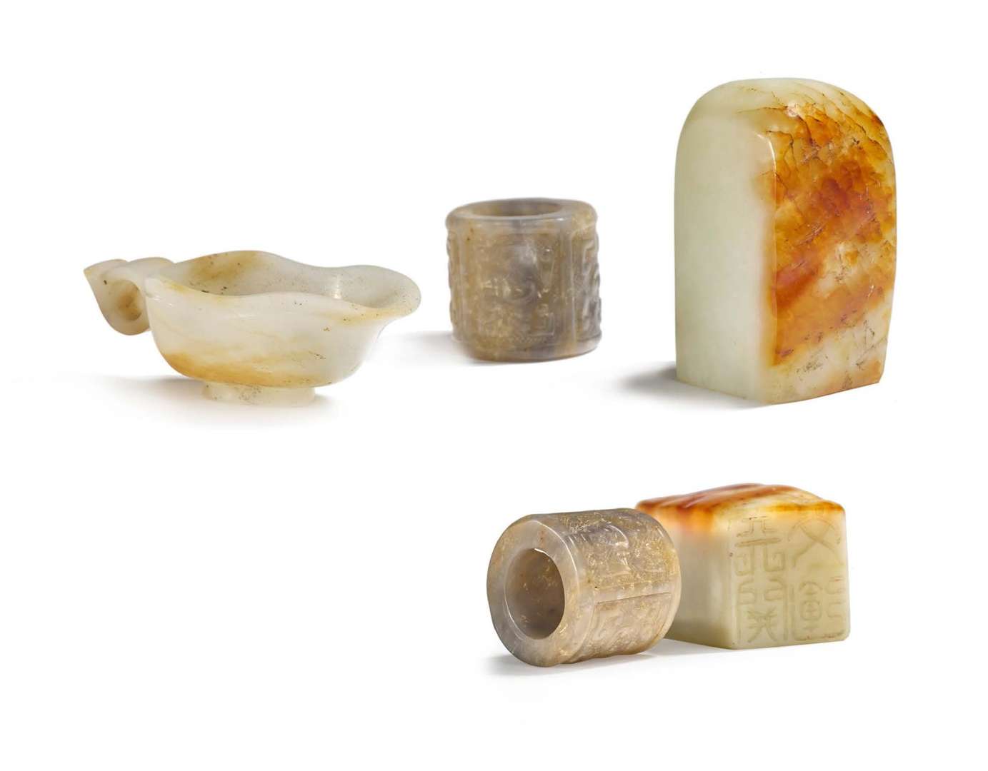 Lot comprenant une coupe rituelle en jade céladon veinée de rouille, un cachet et une bague d'archer en pierres dures, l'une de teinte grise et blanche à décor de motifs archaïsants en léger relief et l'autre quadrangulaire de teinte blanche veinée de rouille, gravée de quatre caractères sigillaires sur sa base.