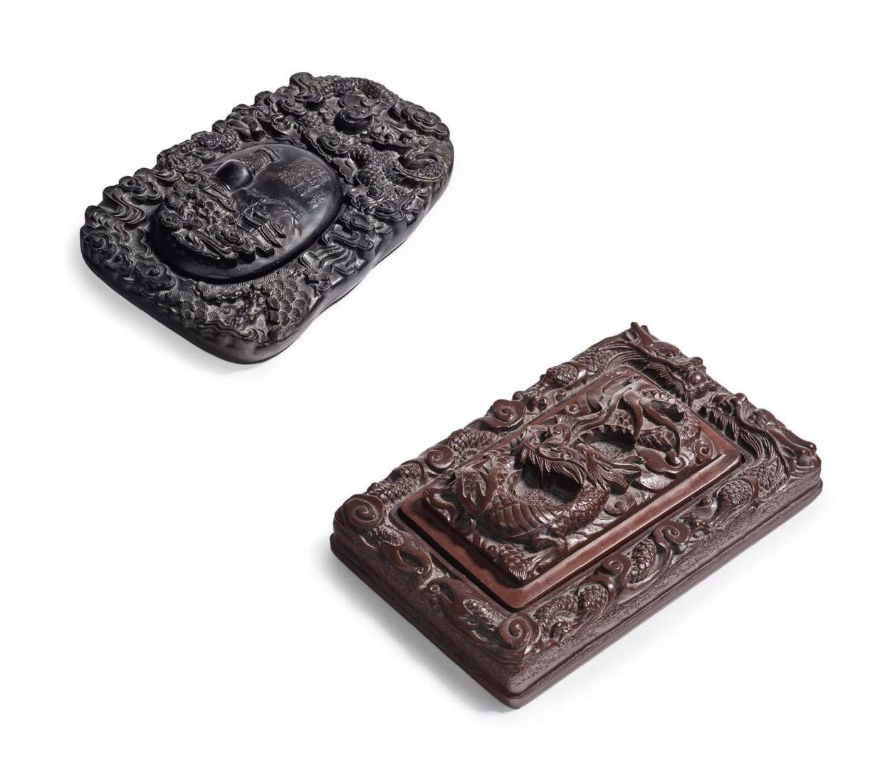 Deux pierres à encre en bois sculpté dont l'une noire à décor en relief de deux dragons poursuivant la perle sacrée parmi des nuages formant des ruyi, au-dessus de flots écumants et pins, en bordure de paysage avec pavillons et stupa de type chörten se détachant sur un fond de montagne et pavillon, avec de courts poèmes calligraphiés sur la pierre, la tablette et son revers.