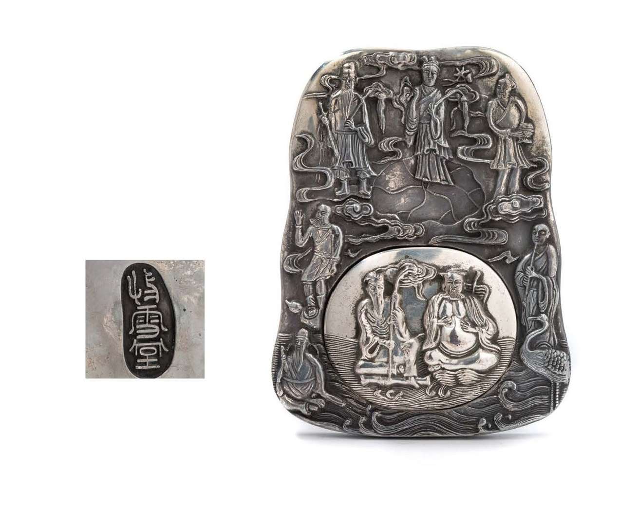 Pierre à encre en métal argenté à décor des huit immortels. Signée au dos.
