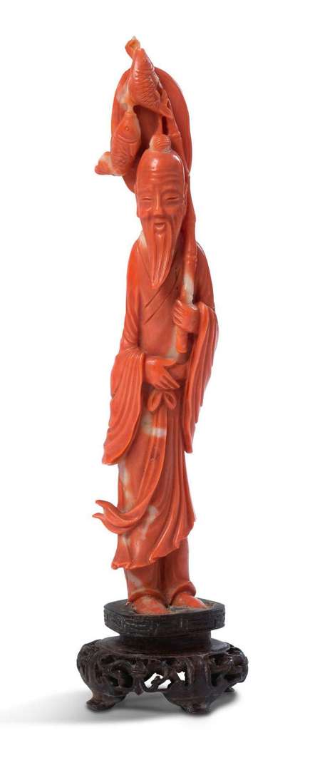 Sujet en corail représentant un dieu taoïste tenant deux poissons au bout d'une perche.