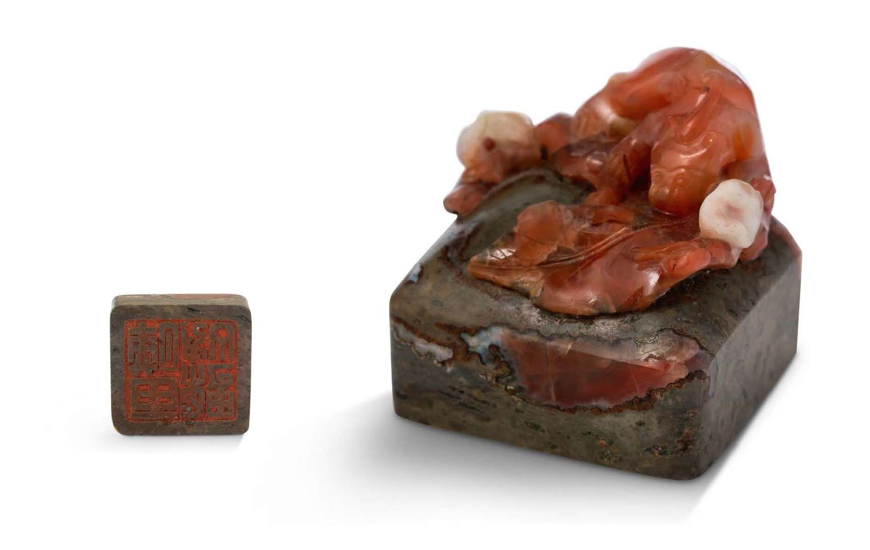 Cachet en agate cornaline représentant un chilong sur une feuille veinée de rouge et blanc.