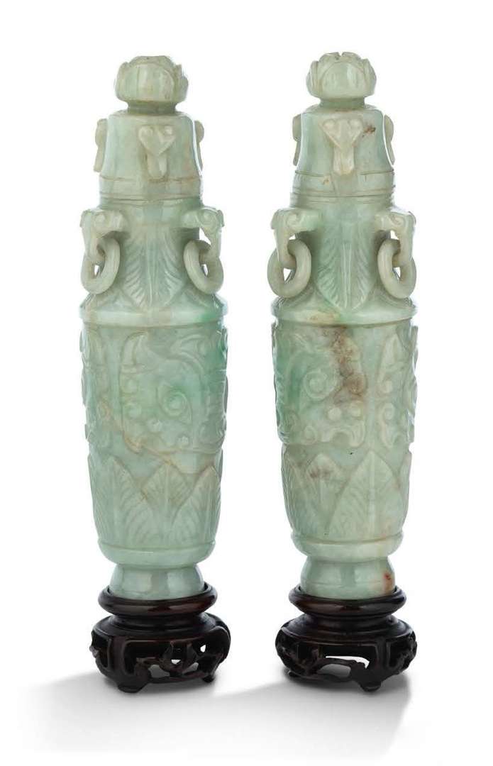 Paire de vases couverts en jadéite à décor de masques de taotie, et feuilles de bananier.