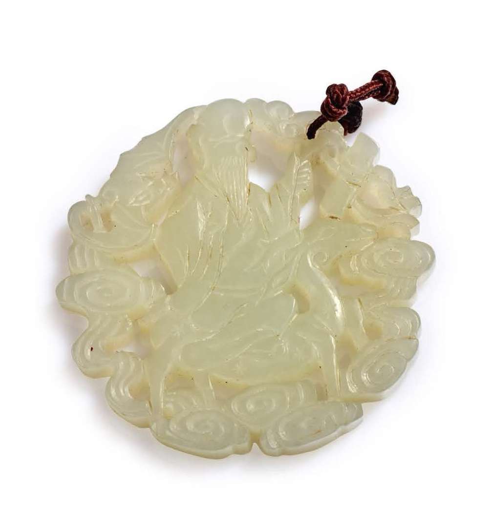 Petit pendentif circulaire en jade céladon, à décor ajouré d'un shoulao sur un daim.