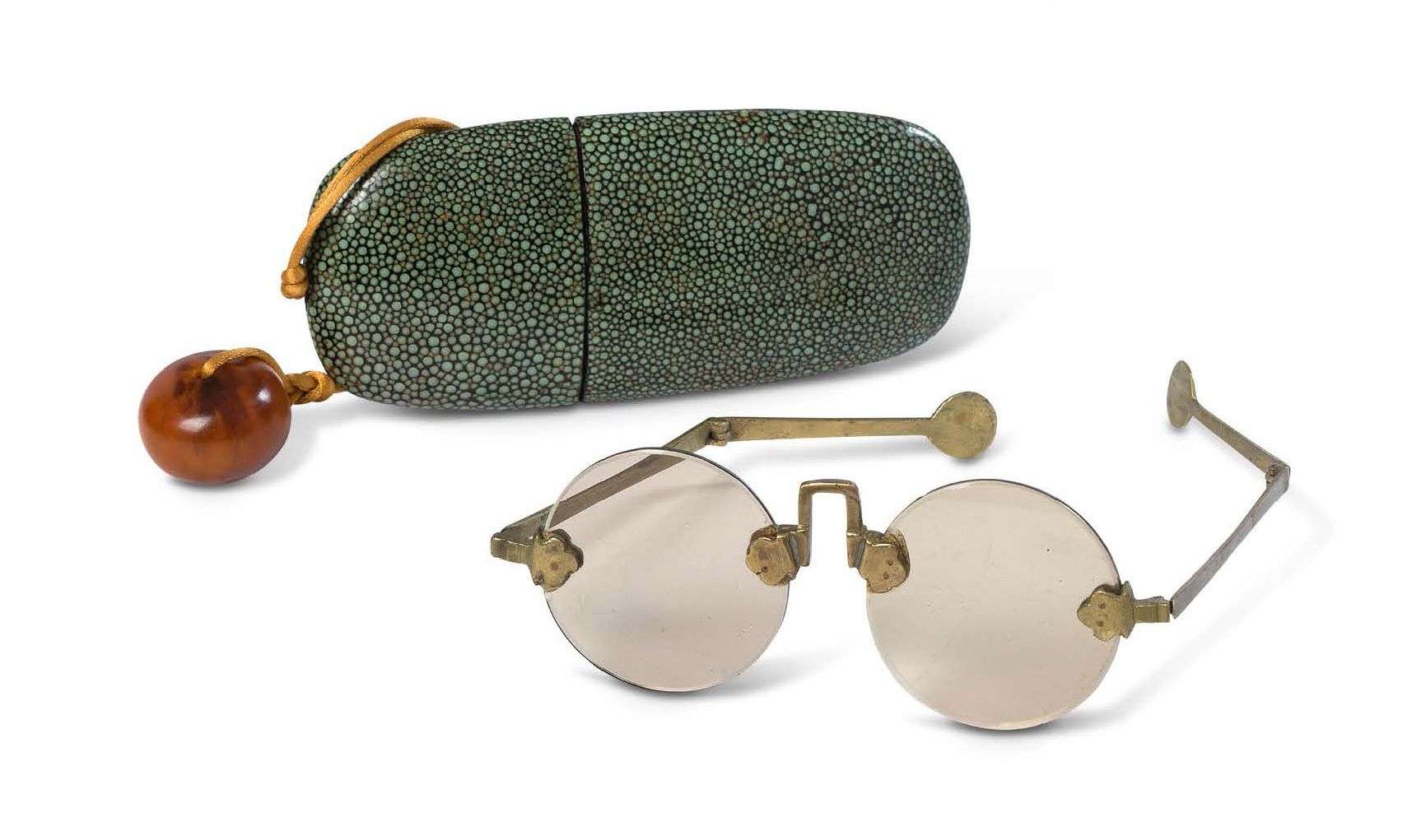 Paire de lunettes pliantes rondes dans un étui en bois recouvert de galuchat vert. Avec monture en laiton.