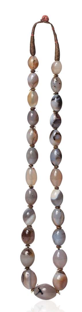 Collier de vingt-cinq perles en agate veinée de gris et beige.