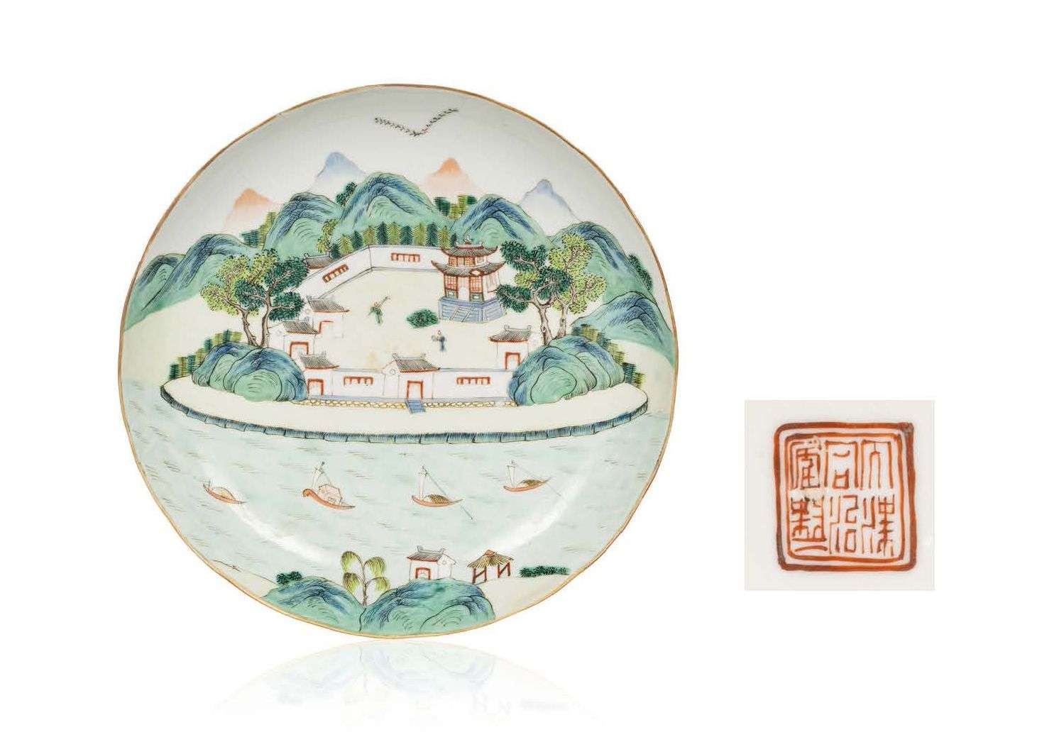 Assiette creuse en porcelaine émaillée polychrome à décor d'embarcations dans un paysage lacustre au bord d'une forteresse sur fond de paysage montagnard. Un vol d'oiseaux en « V » dans le ciel. Le pourtour extérieur à décor de chauves-souris stylisées.