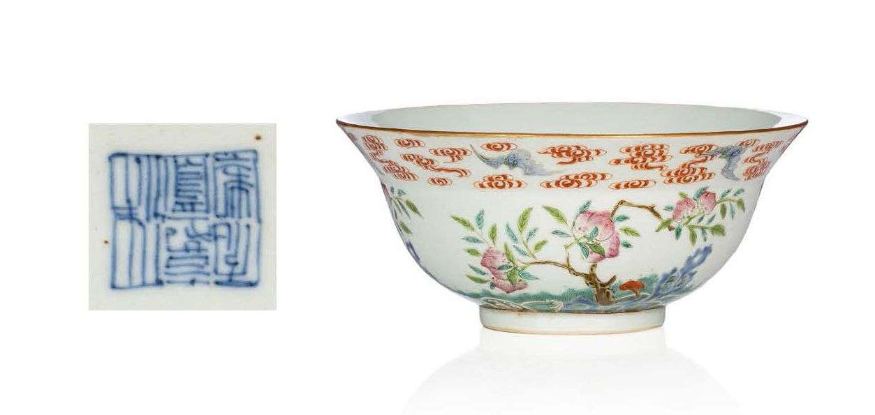 Coupe creuse en porcelaine émaillée polychrome à décor de coloquintes et fleurs en son centre, le bord souligné d'or, le pourtour extérieur à décor de pêchers en fleurs, ruyi et rochers, une frise de nuages sylisés alternés de chauves-souris en partie haute. Marque Guangxu sur la base.