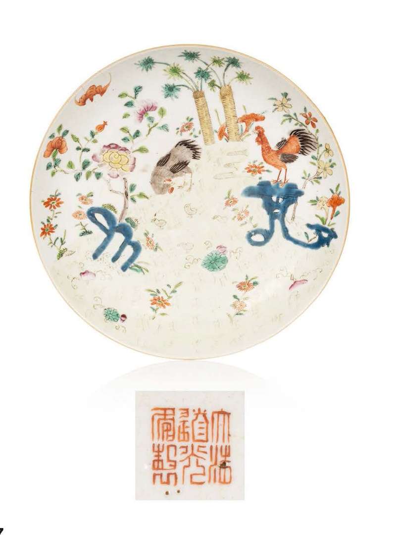 Coupe en porcelaine émaillée polychrome à décor de deux coqs dans un jardin parmi des rochers, fleurs et lotus, une chauve-souris stylisée sur le bord. Marque Daoguang sur la base.