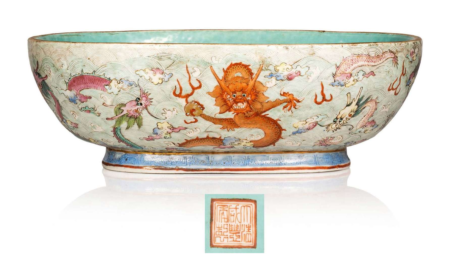 Coupe creuse ovale en porcelaine émaillée polychrome à décor de dragons pourchassant la perle sacrée parmi flots et nuages stylisés sur le pourtour, l'intérieur émaillé bleu, le bord surligné d'or. Marque sur la base.