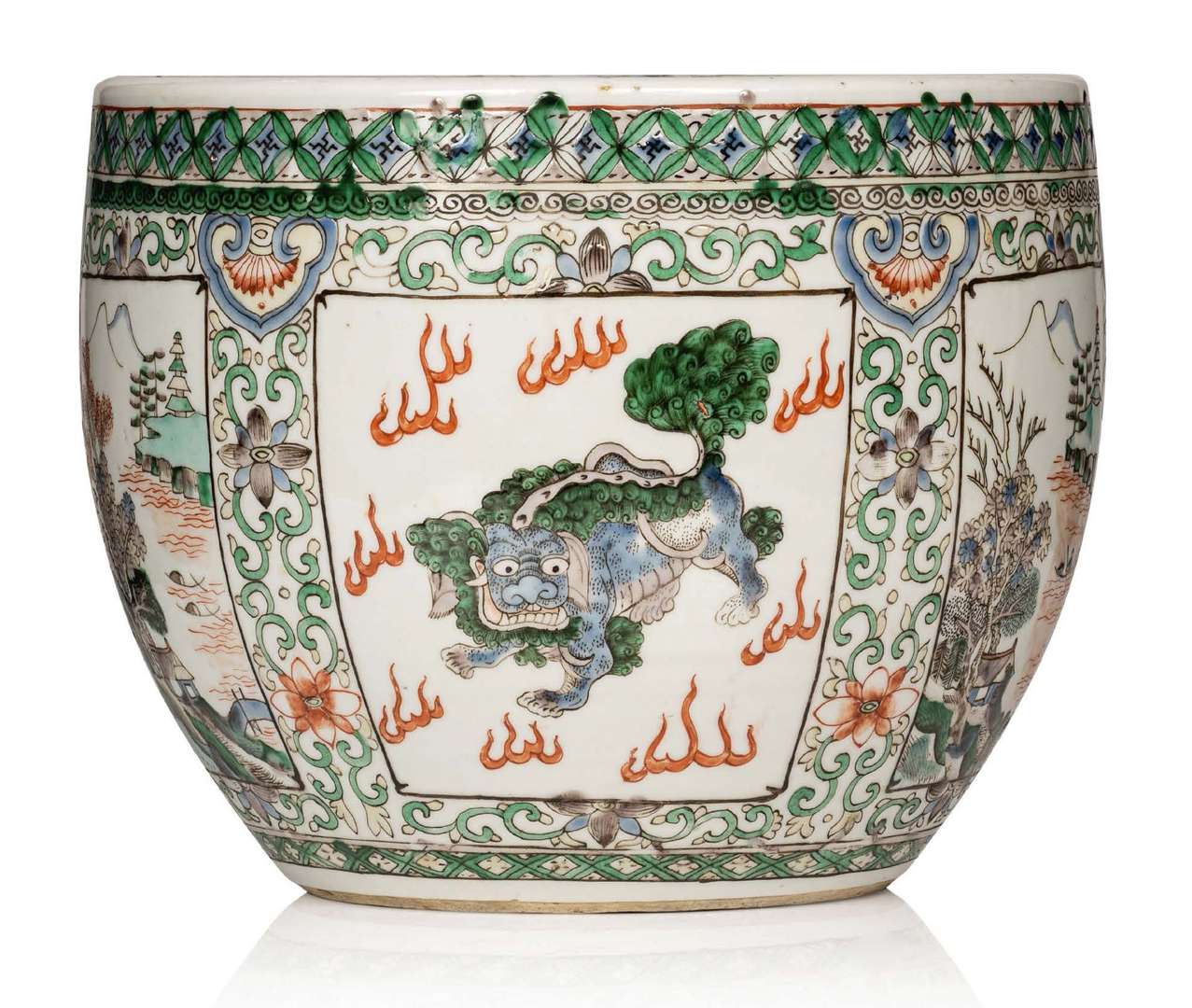 Cache-pot en porcelaine et émaux de la famille verte à décor en médaillons de lions bouddhiques et paysages lacustres.