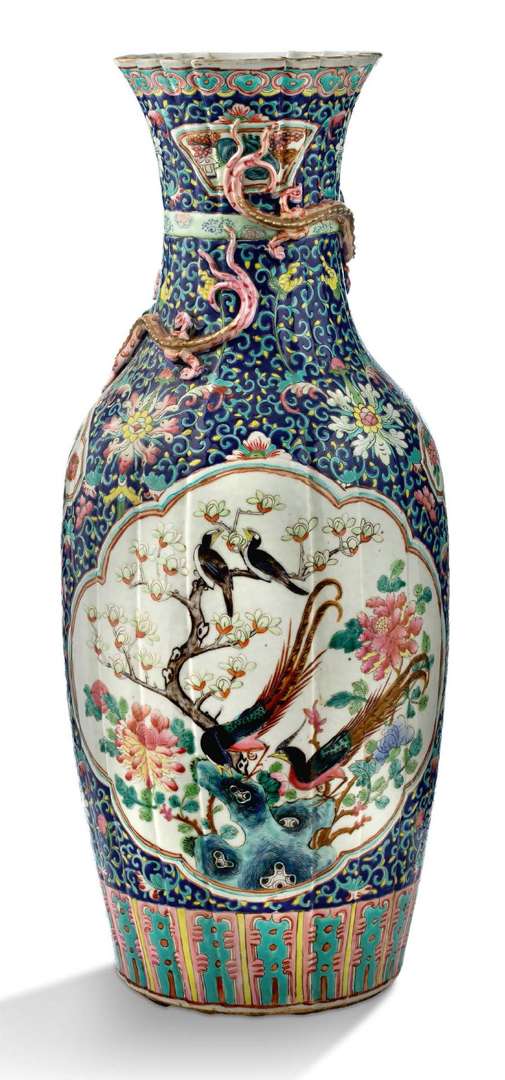 Vase en porcelaine et émaux de la famille rose à décor en médaillons de personnages et oiseaux sur fond de rinceaux feuillagés, la panse et le col évoquant le plissé d'un sac fermé par un lien au niveau du col, autour duquel s'enroulent des chilong en relief, la base en bronze doré avec monture du col en bronze à décor d'une frise ajourée.
