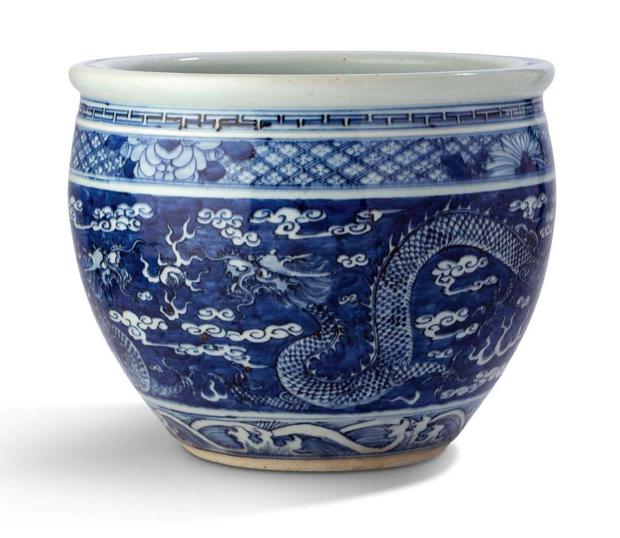 Vasque à poissons à bordure arrondie, en porcelaine blanche à décor en bleu sous couverte de dragons s'affrontant autour de la perle sacrée parmi des nuages auspicieux tsi, au-dessus de flots écumants.
