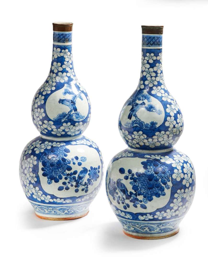 Paire de vases double-gourdes en porcelaine émaillée bleu-blanc à décor en médaillons floriformes d'oiseaux perchés sur des branches de pins et arbres en fleurs, sur fond de fleurs de prunus. Le pied souligné de vagues et le sommet du col d'une frise de motifs géométriques.