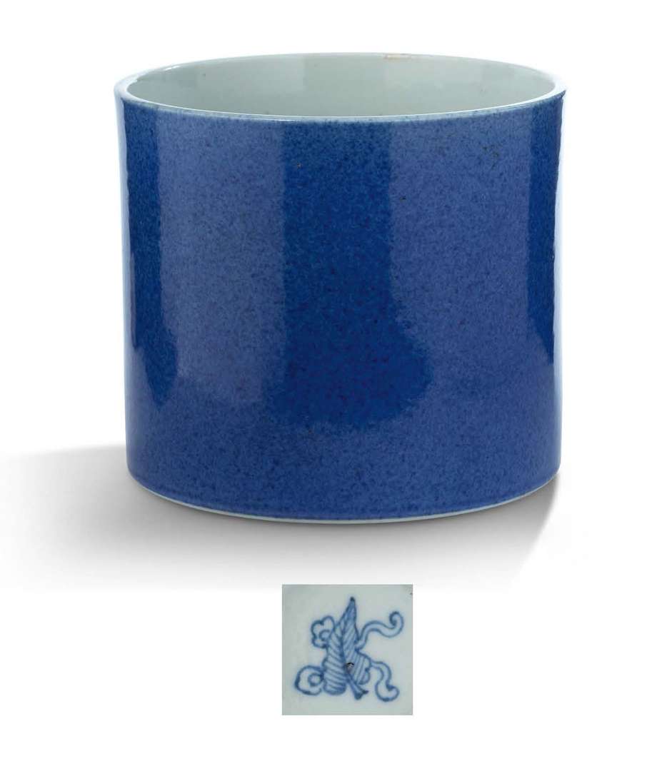 Porte-pinceaux bitong en porcelaine émaillée bleu poudré à l'extérieur et blanc à l'intérieur.