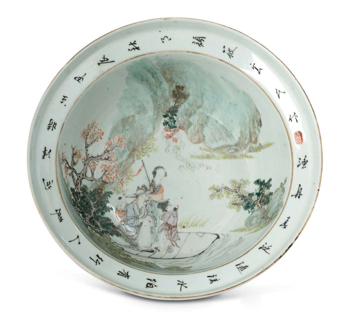 Bassin à bord relevé en porcelaine, à décor en émaux polychromes d'une famille sur une embarcation, sur une rivière bordée de pins sur fond de pics montagneux, le bord orné d'un poème calligraphié.