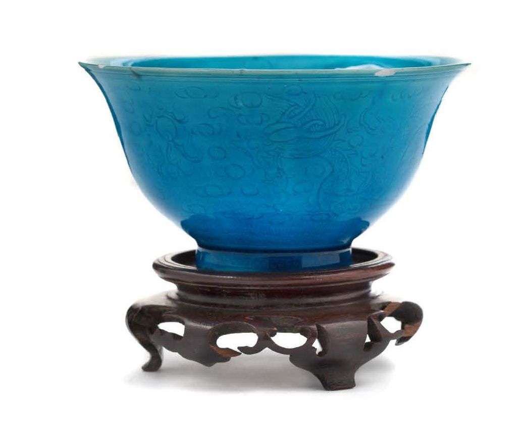 Petite coupe en porcelaine émaillée bleu turquoise à décor gravé sous couverte d'un dragon pourchassant la perle sacrée parmi des nuages stylisés.