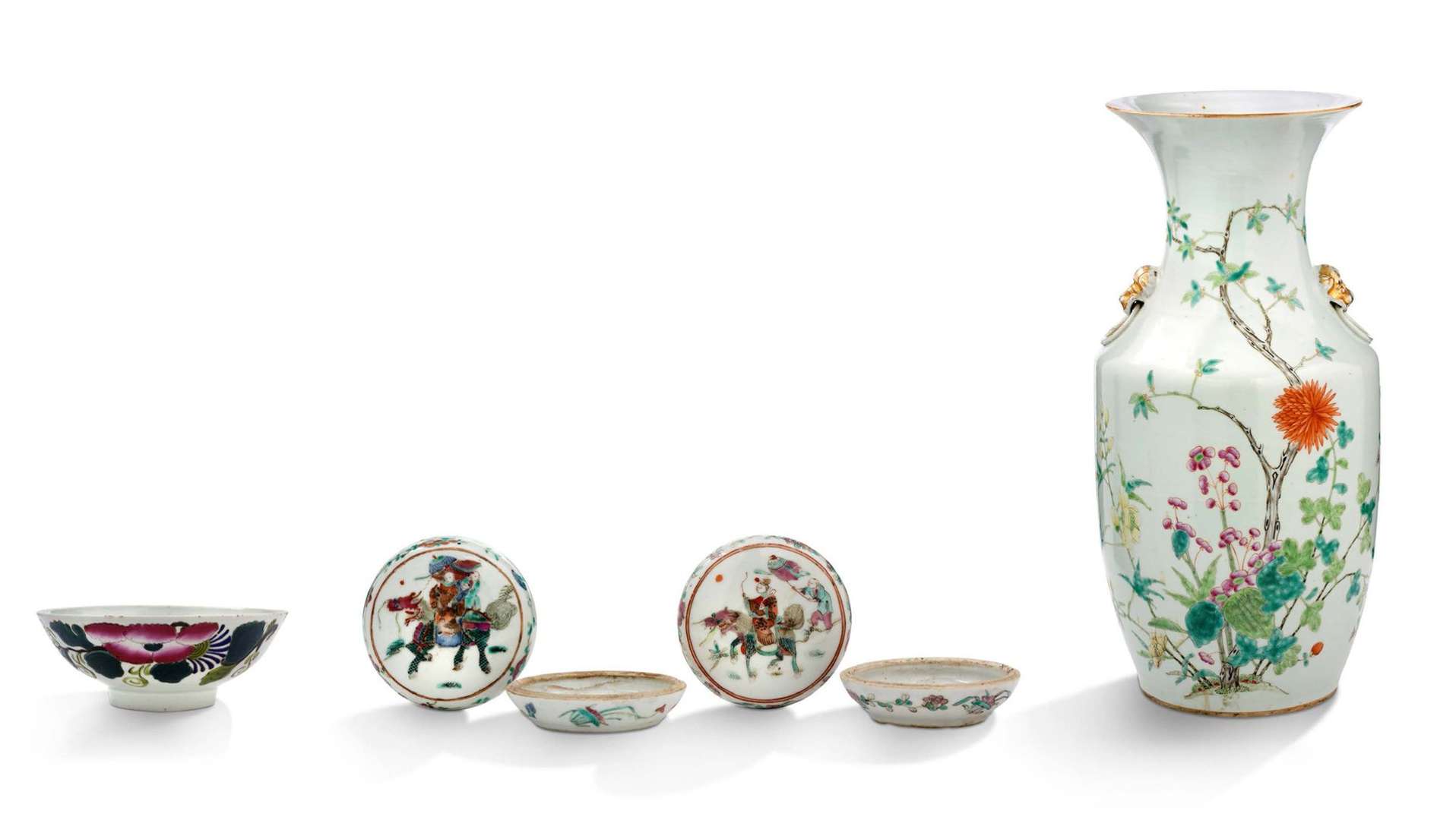 Ensemble comprenant quatre porcelaines dont un vase à décor de fleurs et fond percé, deux boîtes couvertes à décor de cavaliers et une coupe à décor de fleurs.