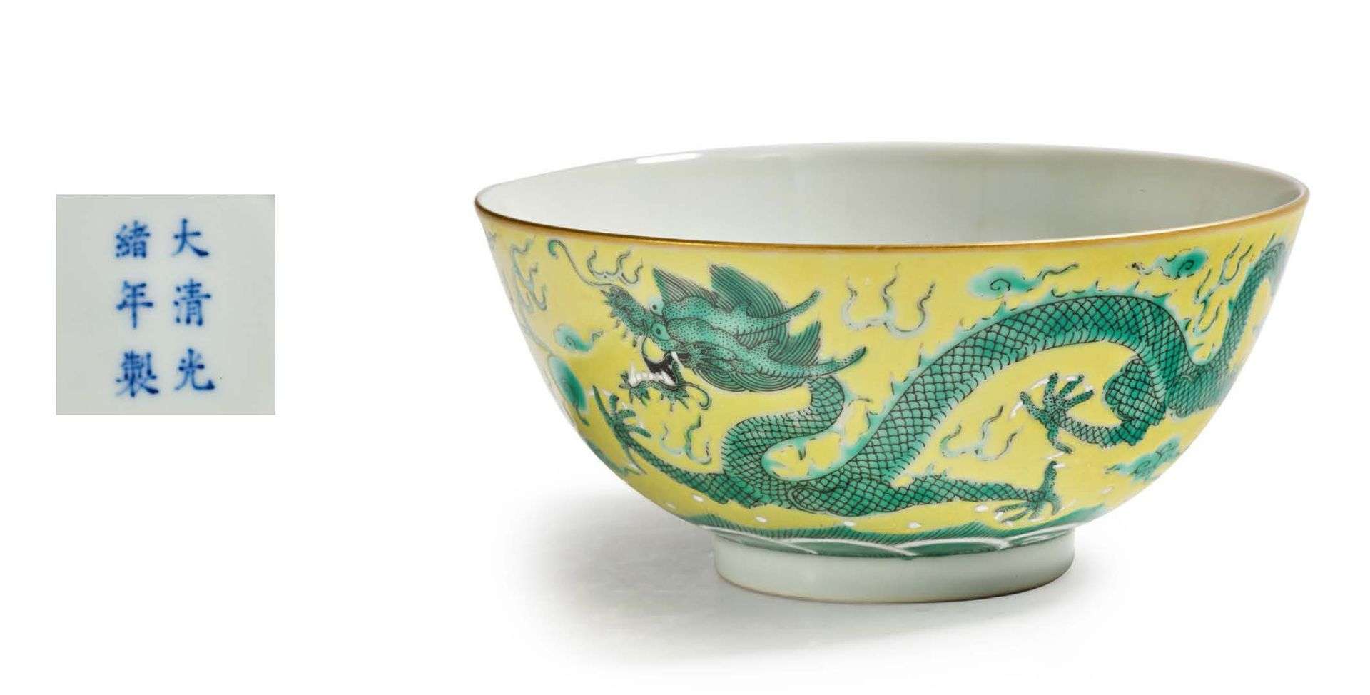 Coupe en porcelaine à décor émaillé vert sur fond jaune, de dragons poursuivant la perle sacrée parmi des nuages, au-dessus de flots écumants. Marque apocryphe Guangxu sur la base.