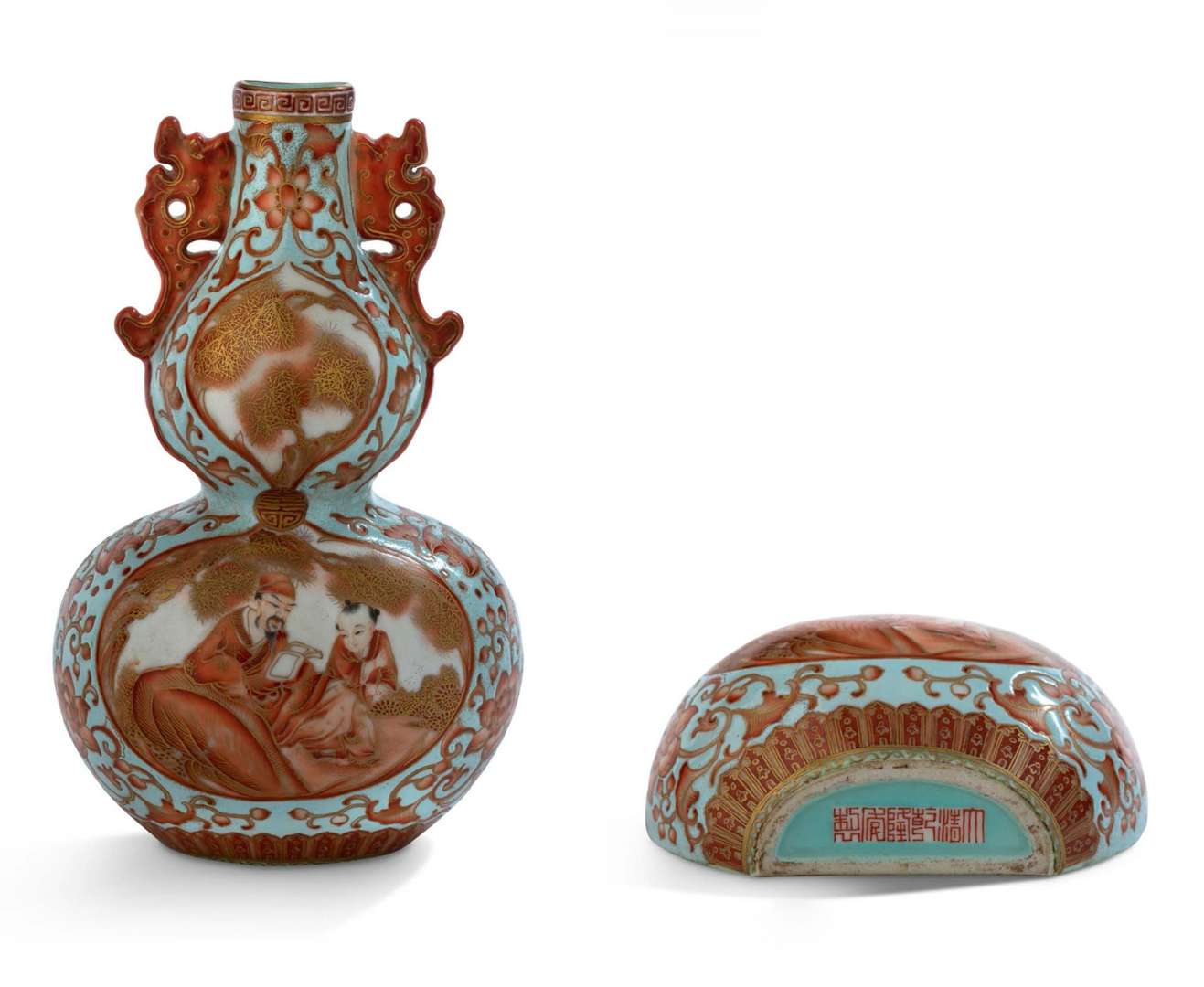 Vase d'applique en forme de coloquinte, en porcelaine à décor corail et or d'un lettré et son jeune disciple auprès d'un pin, dans deux médaillons parmi des rinceaux de lotus animés de chauves-souris, sur un fond vert d'eau, le col rehaussé de deux anses en forme de dragons stylisés. Marque apocryphe