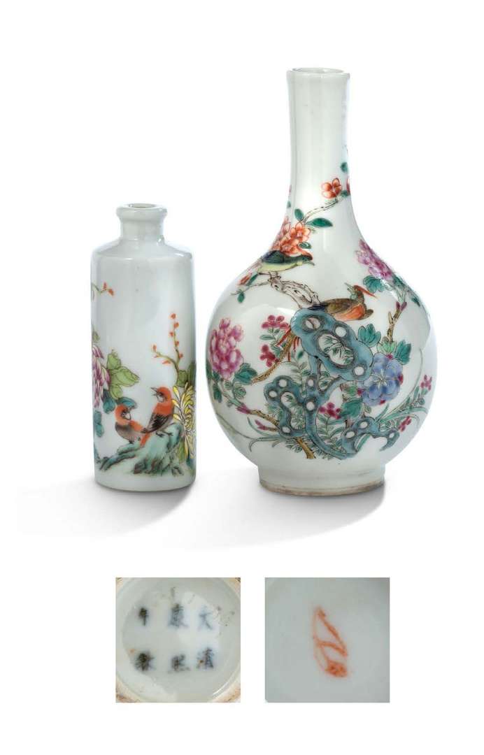 Lot de deux porcelaines émaillées de la famille rose, comprenant un petit vase bouteille avec marque à la feuille apocryphe Kangxi sur la base, et un petit flacon-tabatière, chacun à décor de fleurs et oiseaux.
