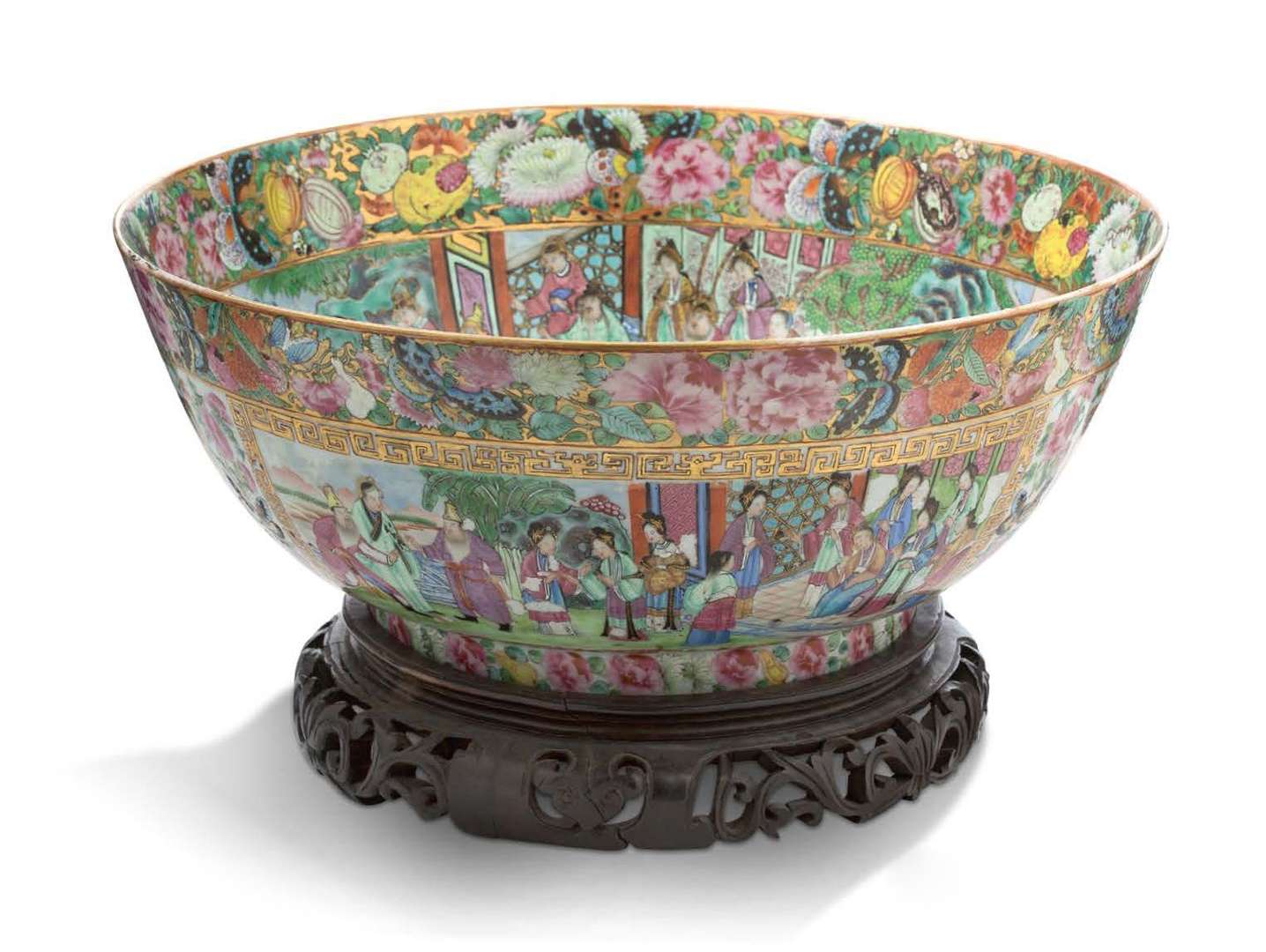 Coupe en porcelaine émaillée de la famille rose à décor de scènes de palais animées de personnages et motifs floraux avec insectes, papillons et oiseaux.