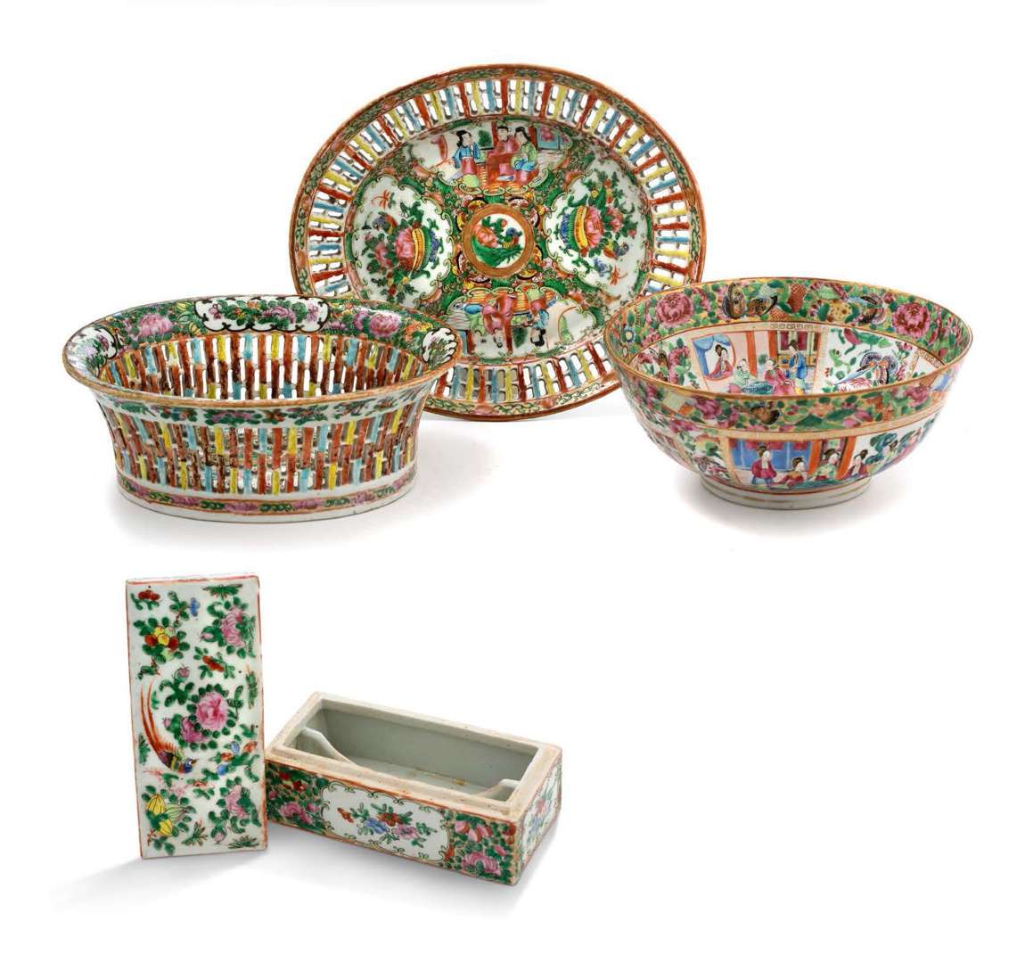 Petit ensemble en porcelaine et émaux de Canton comprenant une boîte rectangulaire couverte, un bol, une coupe et une soucoupe ajourée.