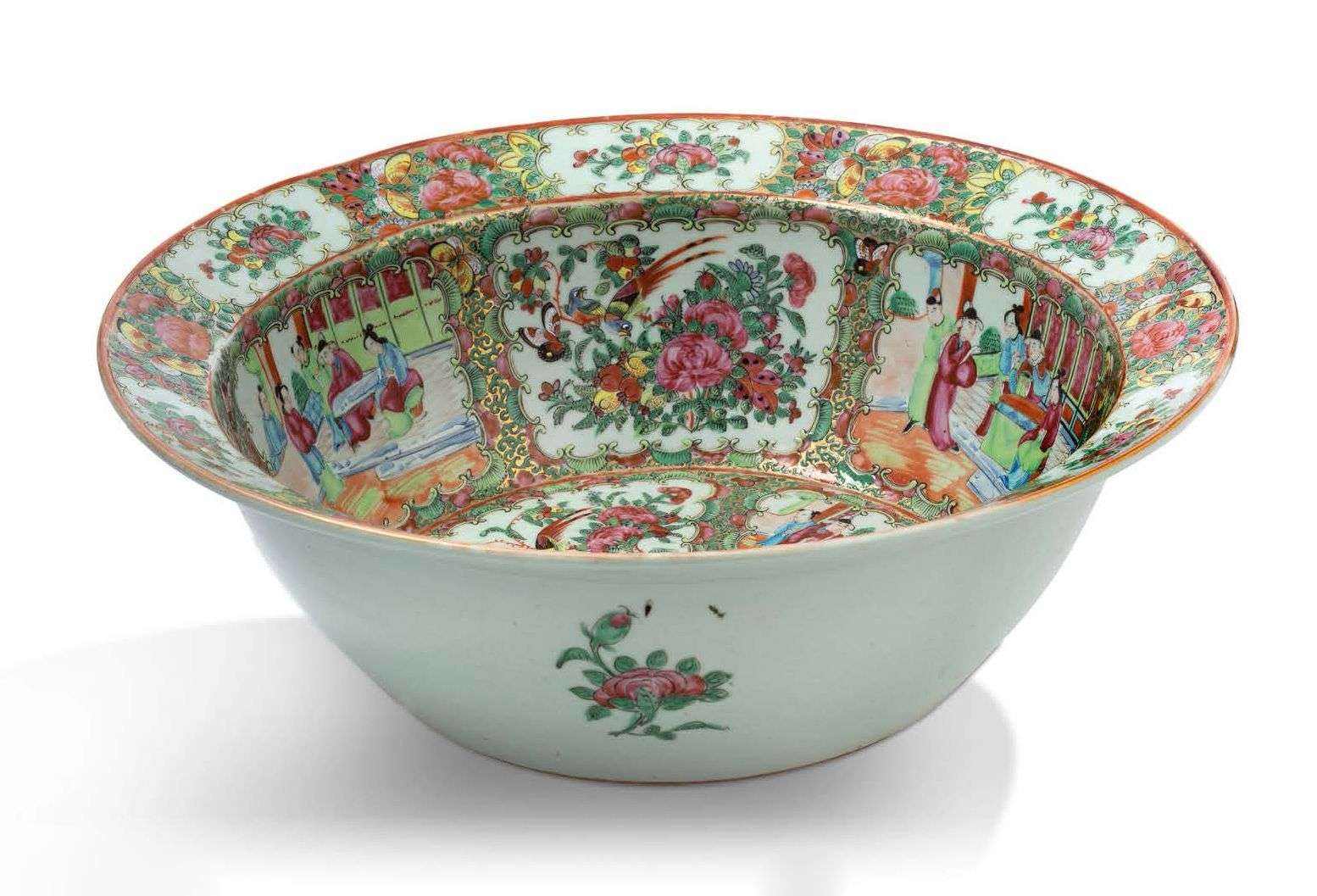 Coupe en porcelaine et émaux polychromes à décor alterné de scènes de palais dans six médaillons rectangulaires sur la paroi interne avec personnages et oiseaux parmi des fleurs.