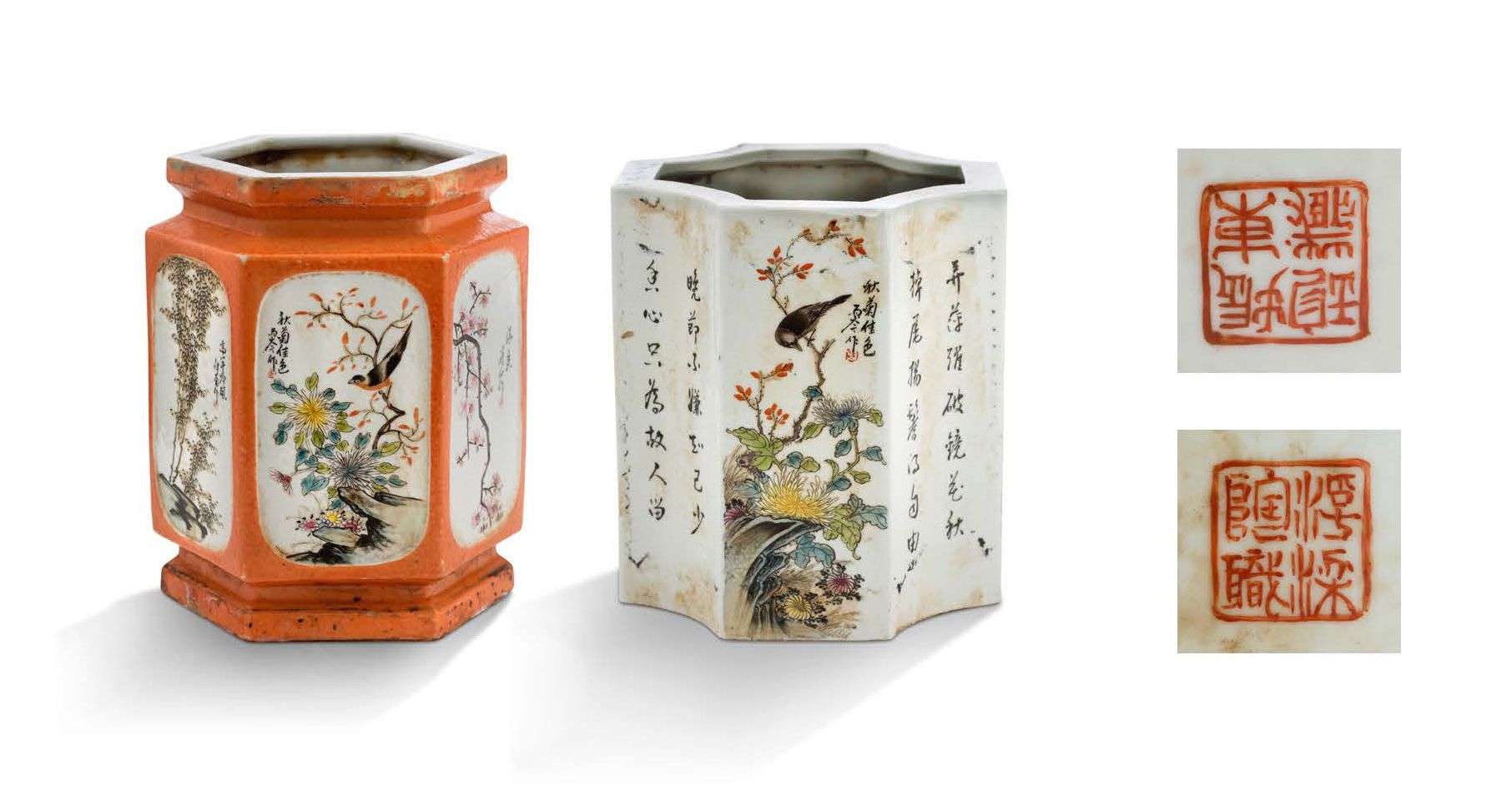 Deux porte-pinceaux en porcelaine, l'un hexagonal à décor en médaillon polychrome sur fond corail, d'oiseaux, poissons, insectes, prunus et arbustes en fleurs, avec marque « Collection de Zhendong » | l'autre octogonal à bords polylobés, à décor polychrome de poissons, oiseaux et arbustes en fleurs, alternant avec poèmes, avec marque « Collection de Fuliang ».