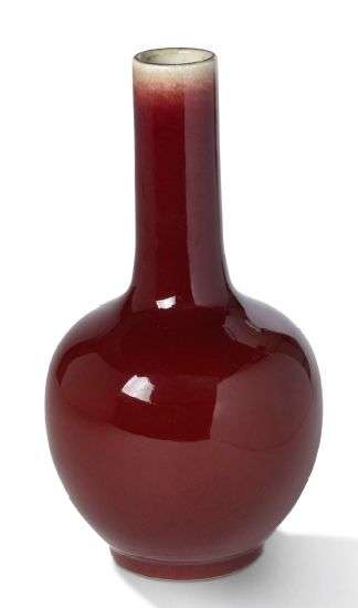 Vase bouteille tianqiuping en porcelaine et émail sang de boeuf sur un fond céladon visible en haut du col.