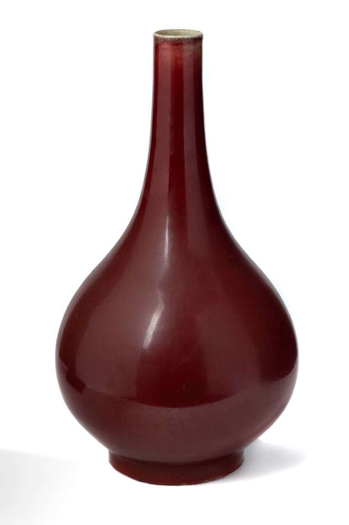 Vase bouteille à long col et panse piriforme, en porcelaine à glaçure sang-de-boeuf, sur un fond céladonné visible sur la base et à l'intérieur du col.