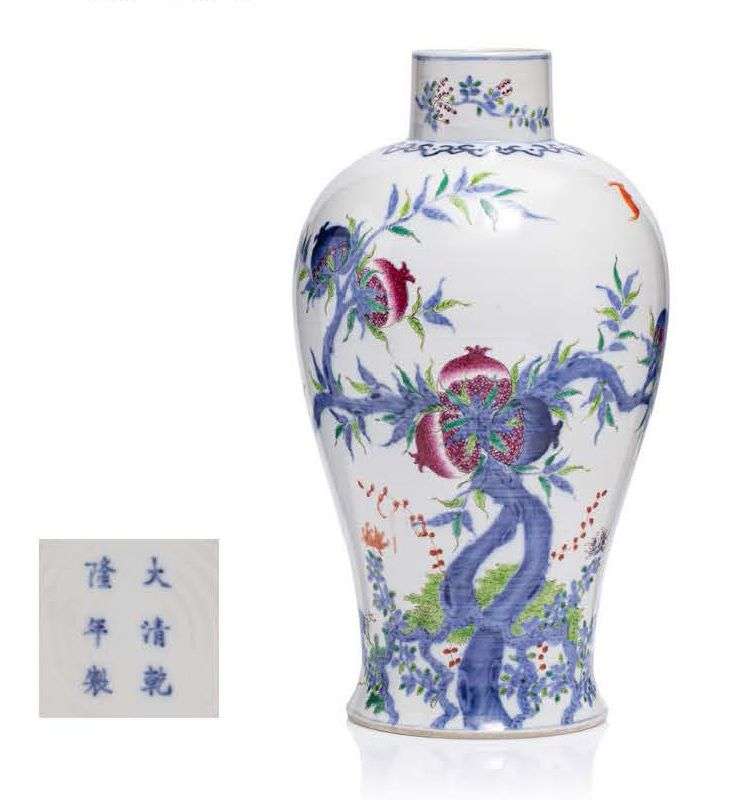 Vase balustre en porcelaine et émaux bleu et de la famille rose, à décor d'un grenadier survolé par des chauves-souris, le col orné d'une guirlande de ruyi.