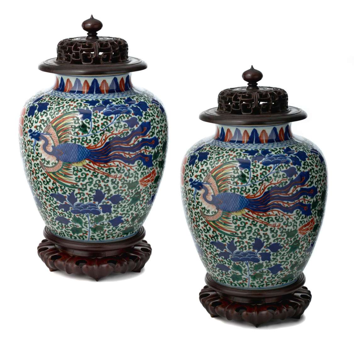 Paire de potiches en porcelaine à décor émaillé Wucai de phénix parmi des pivoines et rinceaux feuillagés, le col souligné de feuilles de bananier corail et bleu.
