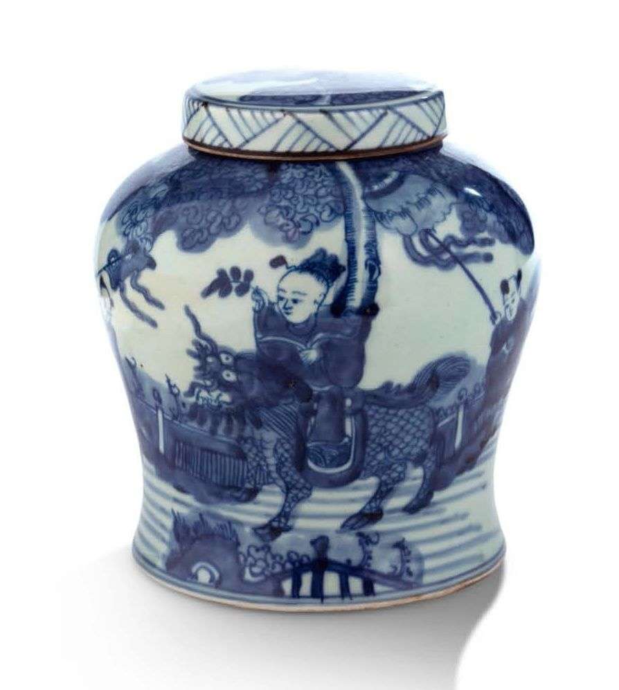 Petit vase couvert de forme balustre, en porcelaine à décor de personnages en bleu sur fond céladon.