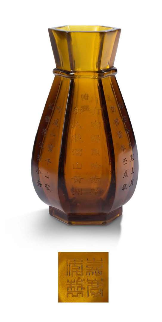 Petit vase hexagonal en verre jaune à décor incisé de poèmes calligraphiés, avec marque apocryphe Jiaqing.