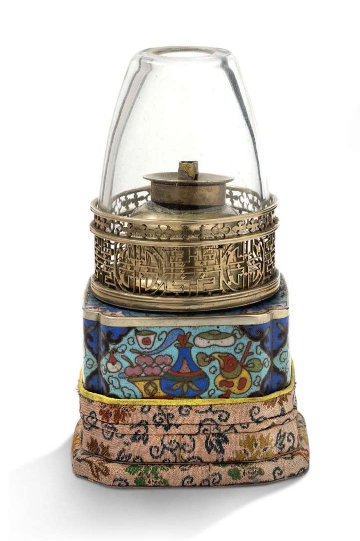 Petite lampe de fumeur d'opium en émaux cloisonnés avec son présentoir.