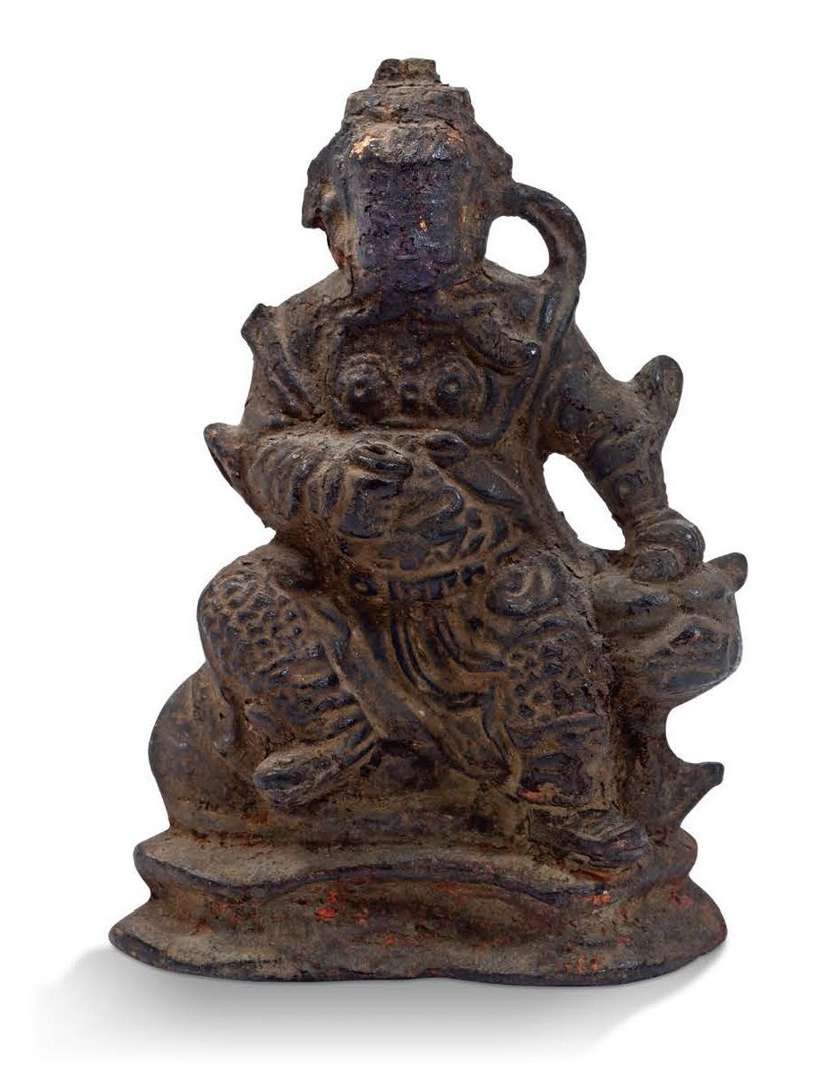 Sujet en bronze avec traces de dorures et polychromie, représentant un Guandi (dieu guerrier) assis sur un lion bouddhique.