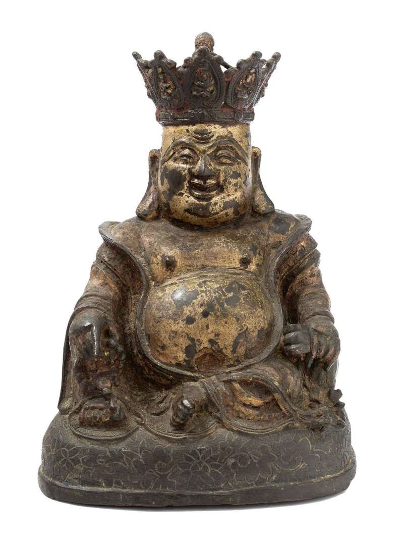 Sujet en bronze avec traces de dorures et de polychromie, représentant Milefo (ou Bouddaï) couronné, assis en lalitasana (délassement royal), tenant son rosaire dans la main droite et un lacet dans la main gauche.