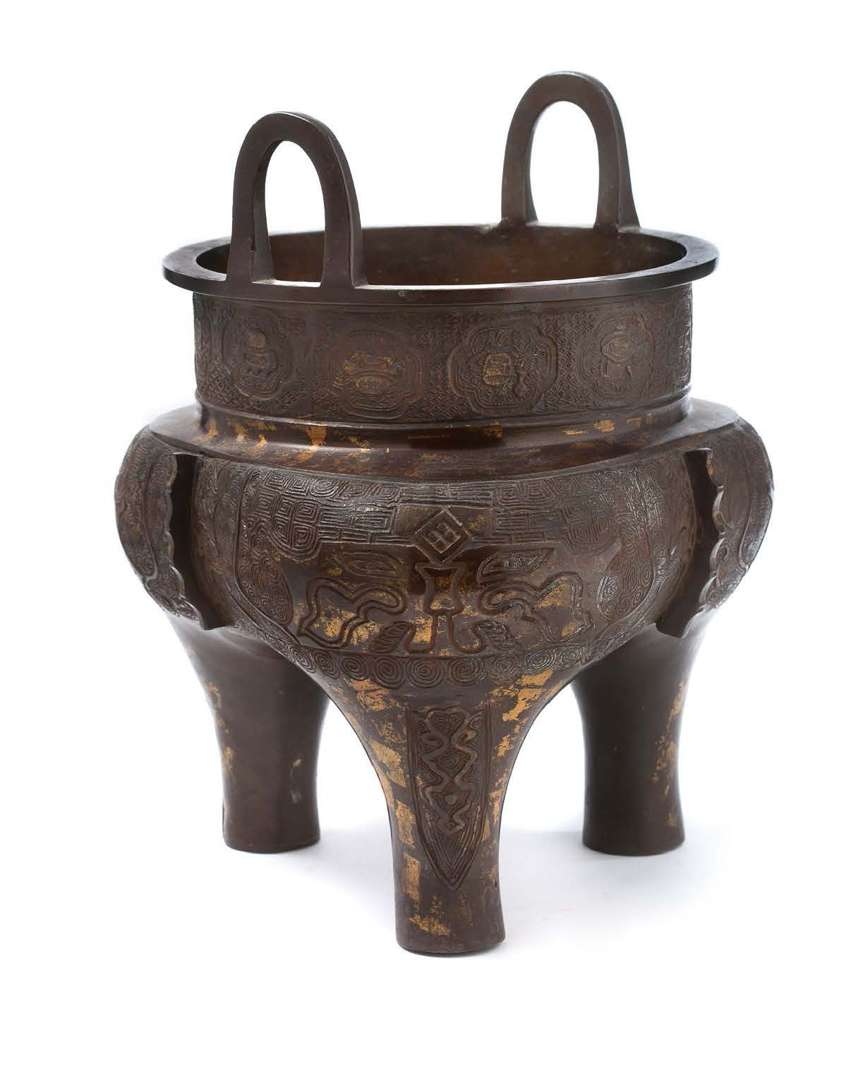 Vase tripode archaïsant de forme jia en bronze à décor « gilt-splashed ».