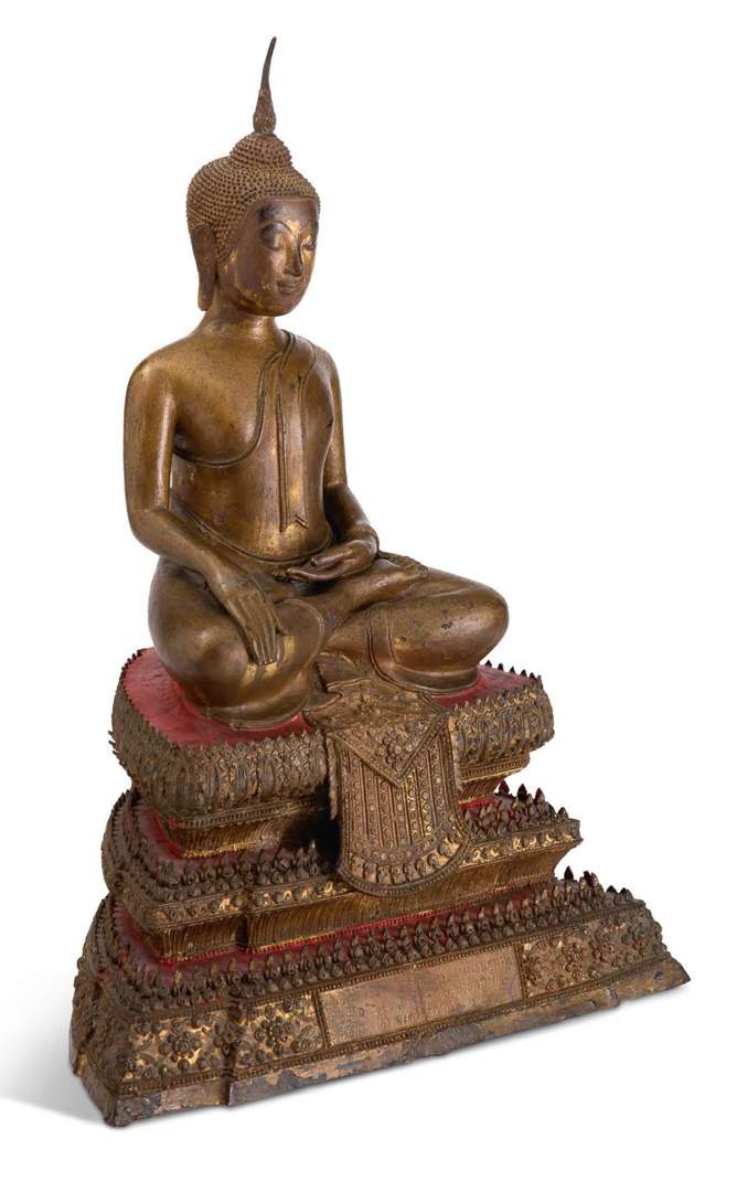 Important sujet en bronze avec dorure et laque rouge, représentant le Bouddha assis sur une triple base, la main droite prenant la terre à témoin (bhumisparsa mudra).