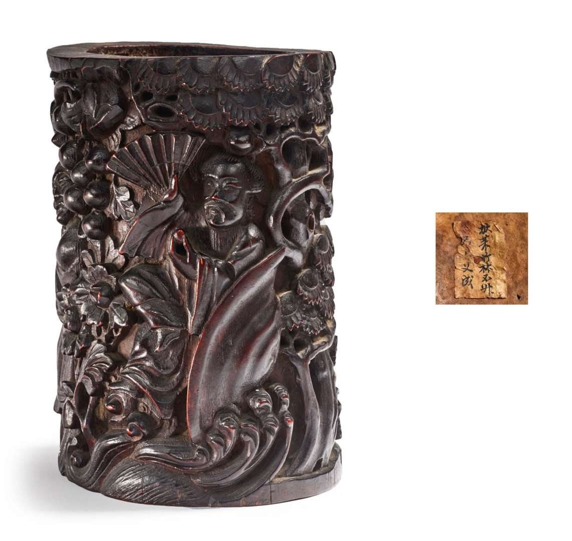 Porte-pinceaux bitong en bambou de patine foncée, sculpté en haut relief d'Immortels dans une forêt de pins, pampres, fleurs et fruits, l'un hêlant au loin avec un foulard, l'autre transporté sur un coquillage au-dessus des flots, tenant un éventail dans sa main droite et une perle dans sa main gauche.