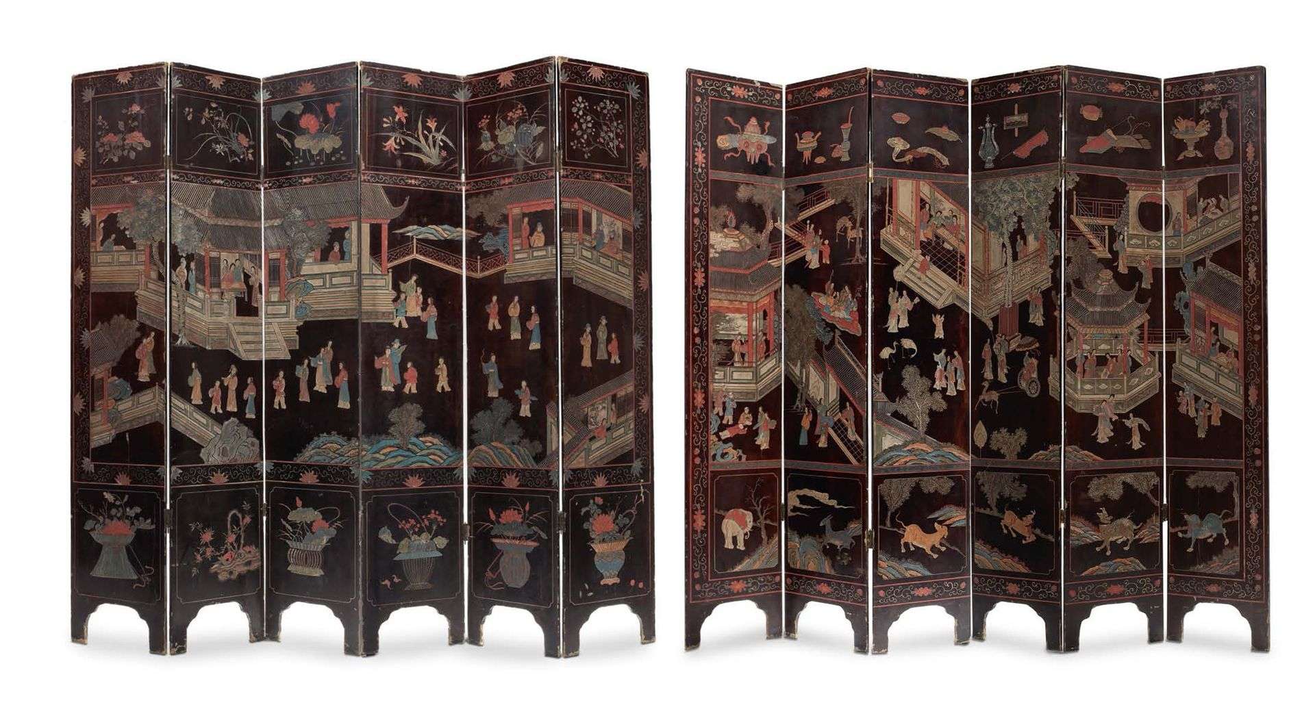 Grand paravent de type Coromandel, à six feuilles, en bois laqué à fond noir, chaque face à décor polychrome sculpté en léger creux, représentant des scènes animées de nombreux personnages, femmes et enfants se distrayant dans un jardin parmi des pavillons sur une face, de familles évoluant aurpès d'une demeure sur l'autre face, les parties hautes et basses ornées d'objets mobiliers, fleurs et paniers fleuris.