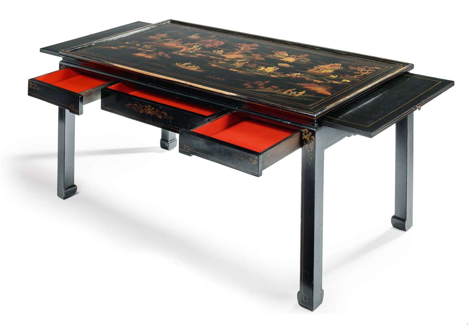 Bureau plat ouvrant à trois tiroirs en bois laqué à décor à l'or d'une scène de la vie quotidienne animée de cavaliers, paysans, femmes aux abords d'un pont, entourés de pagodons et animaux, dans un paysage lacustre.