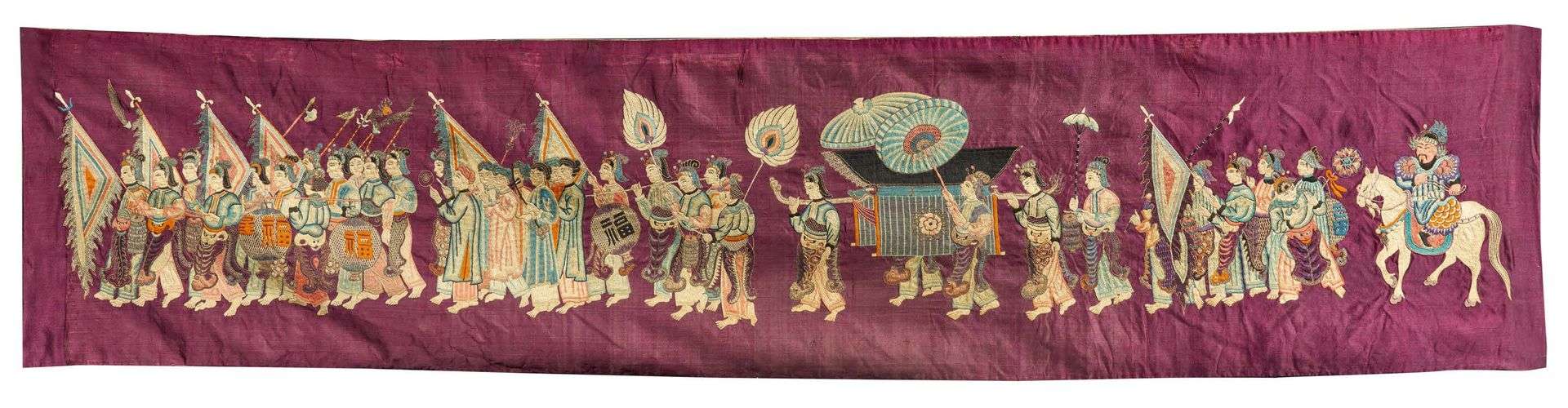 Long panneau horizontal en soie prune brodée aux fils polychromes d'une procession d'hommes et femmes, musiciens, porteurs de drapeaux, certains avec des lanternes ornées du caractère « Bonheur », un cavalier fermant la marche | doublé de soie beige.